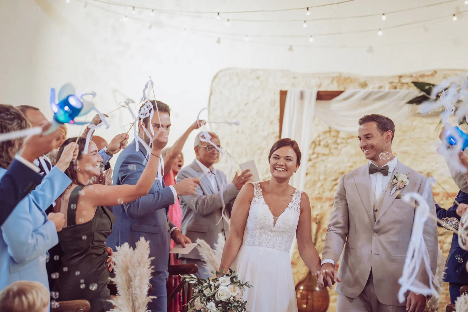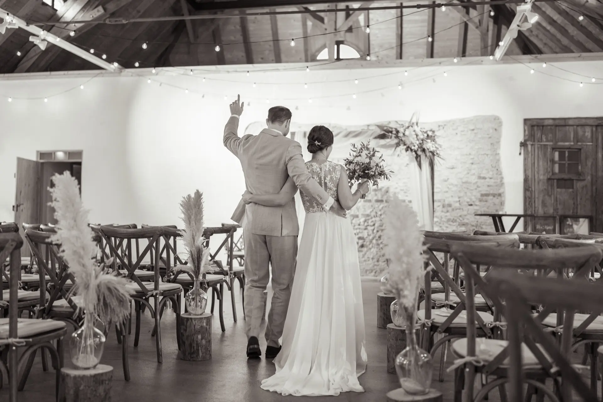 Die Zeremonie fand in der gemütlichen Atmosphäre der Remise statt. Besonders emotional wurde es durch die Traurednerin: Steffis eigene Schwester führte durch die freie Trauung. Es war persönlich, es war nah und es blieb kaum ein Auge trocken. Egal ob beim Brautpaar, den Gästen oder der Rednerin selbst – die Freudentränen kullerten. Nach den sehr persönlichen Ehegelöbnissen und dem Ringtausch zogen die beiden unter dem Jubel der tobenden Menge in ihr neues Leben als Ehepaar ein, bzw. aus.