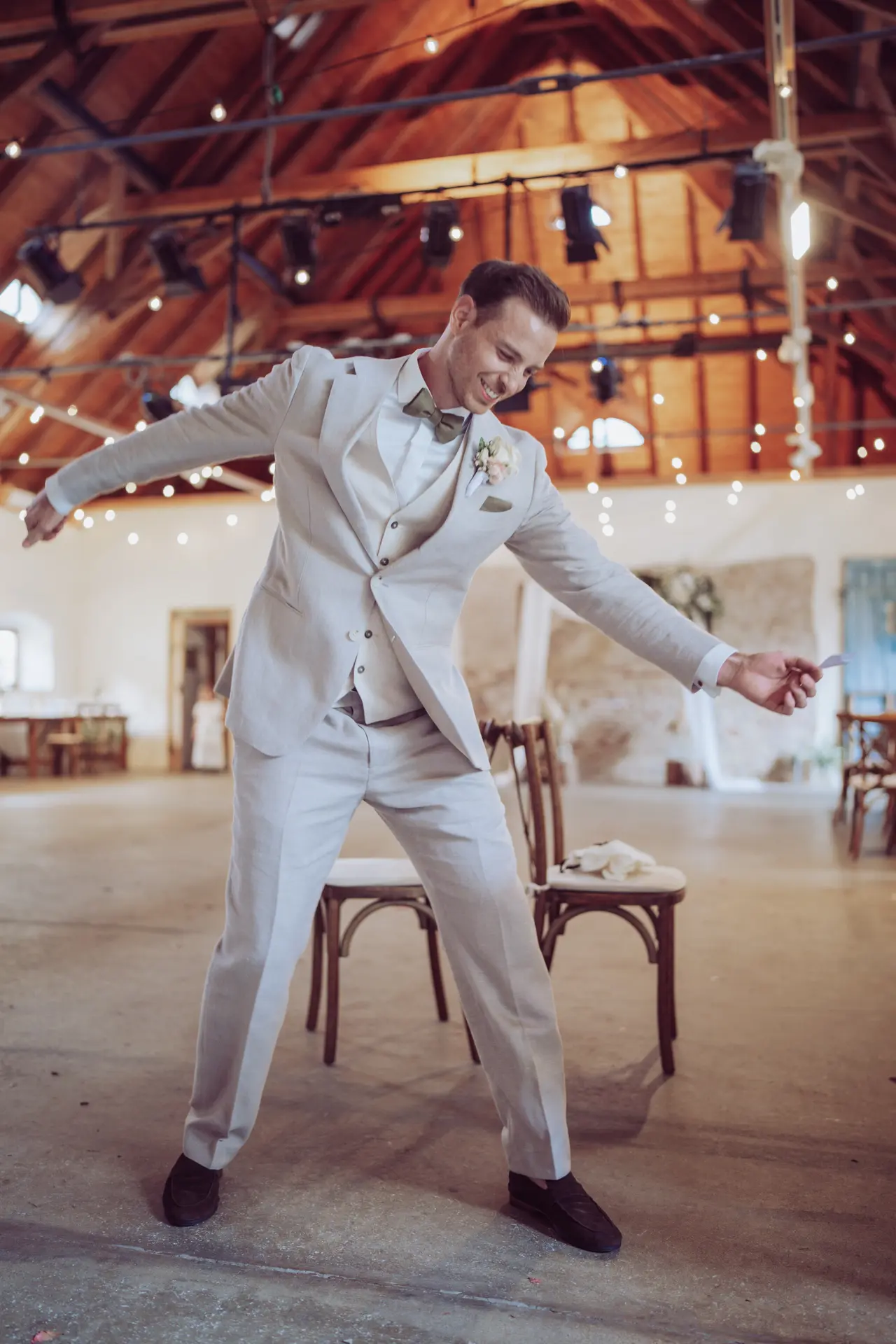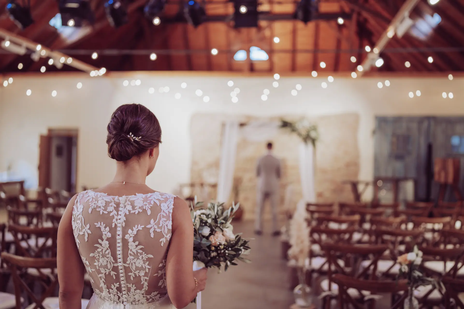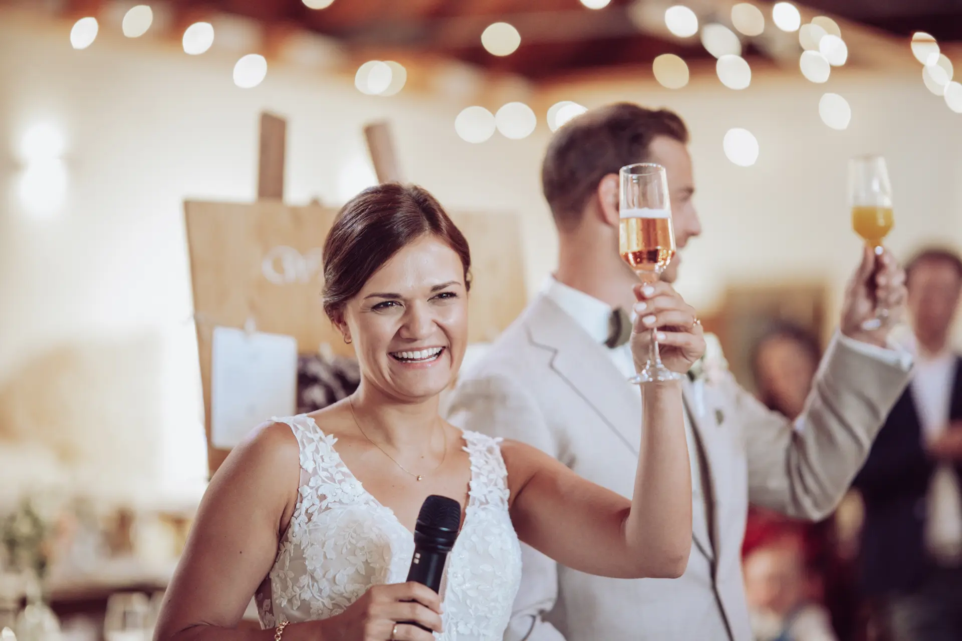 Für den entspannten Sektempfang und die anschließende Party bietet die Remise eine geniale Kulisse. Steffi und Michi hatten sich bei der Deko selbst übertroffen: Spielestationen für die Gäste, liebevolle Tischdeko und – mein fotografisches Highlight – unzählige Lichterketten. Dieses warme Licht sorgt gerade an grauen Tagen für eine unfassbar gemütliche Stimmung auf den Fotos.