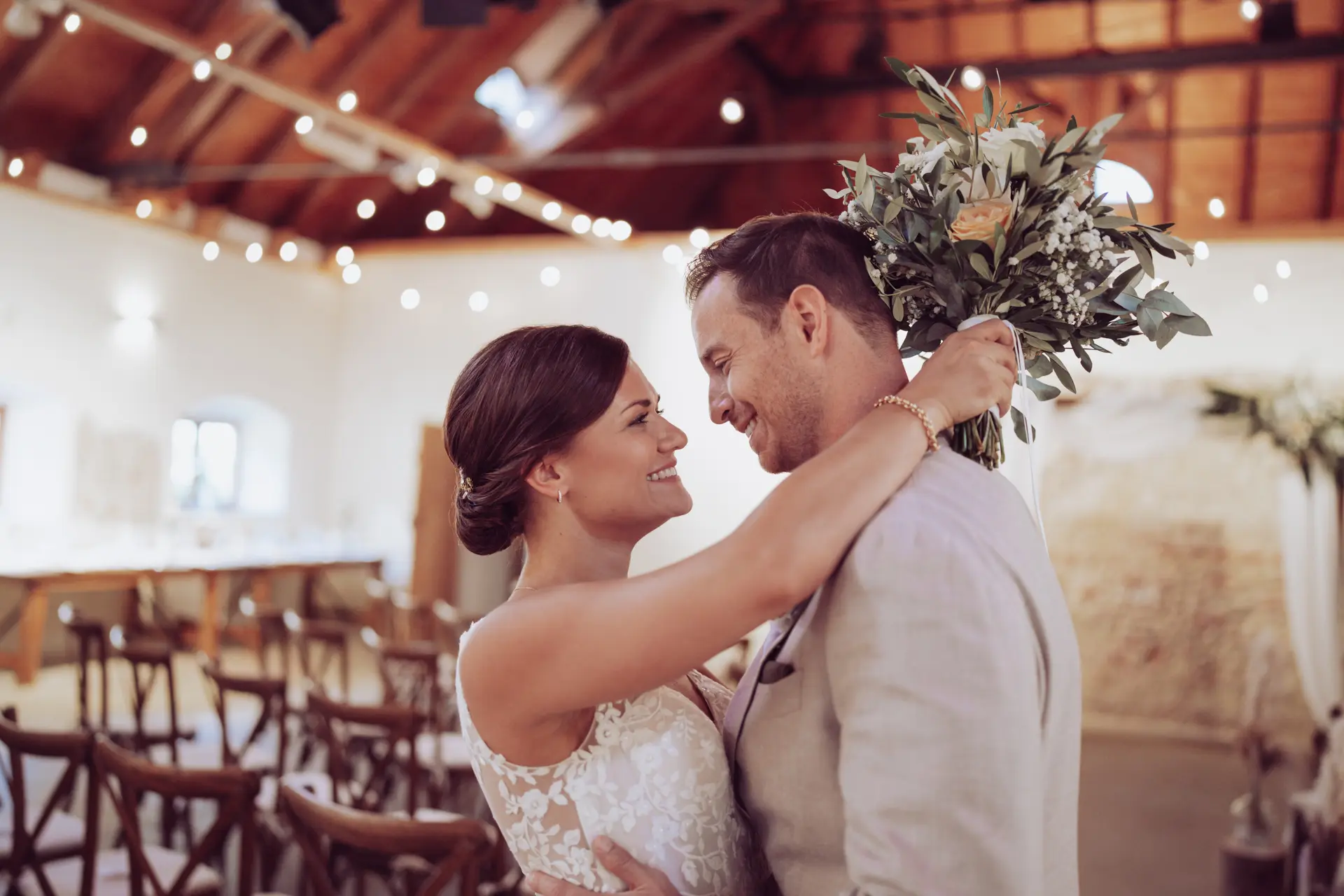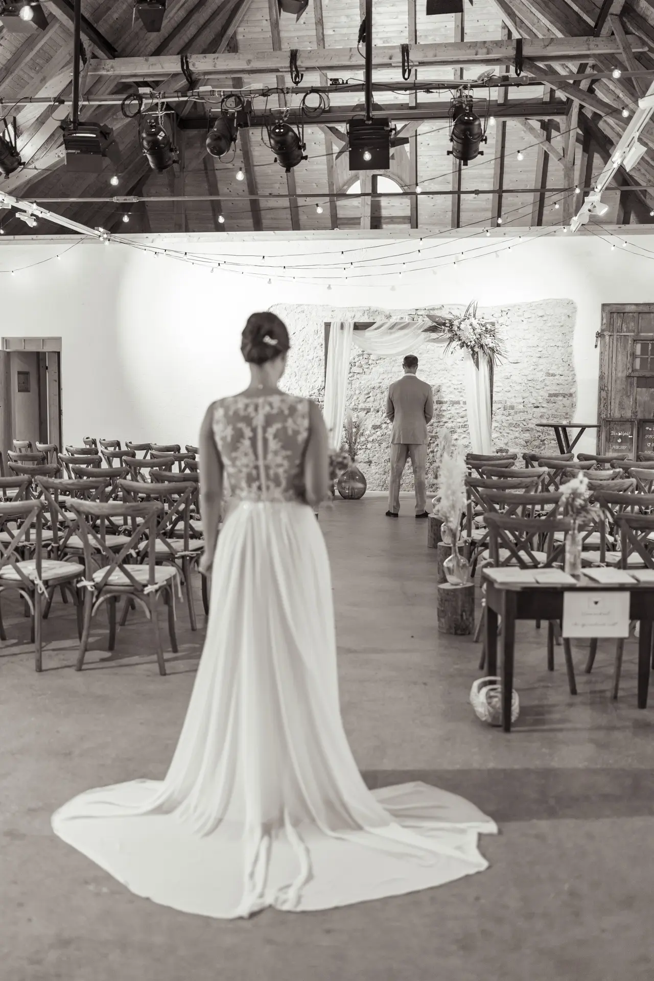 Da der Wettergott heute keine Sonnenstrahlen schicken wollte, verlegten wir den First Look spontan in den geschützten Bereich der Remise. Und ganz ehrlich? Das Strahlen von Steffi und Michi, als sie sich das erste Mal sahen, war heller als jede Septembersonne.
