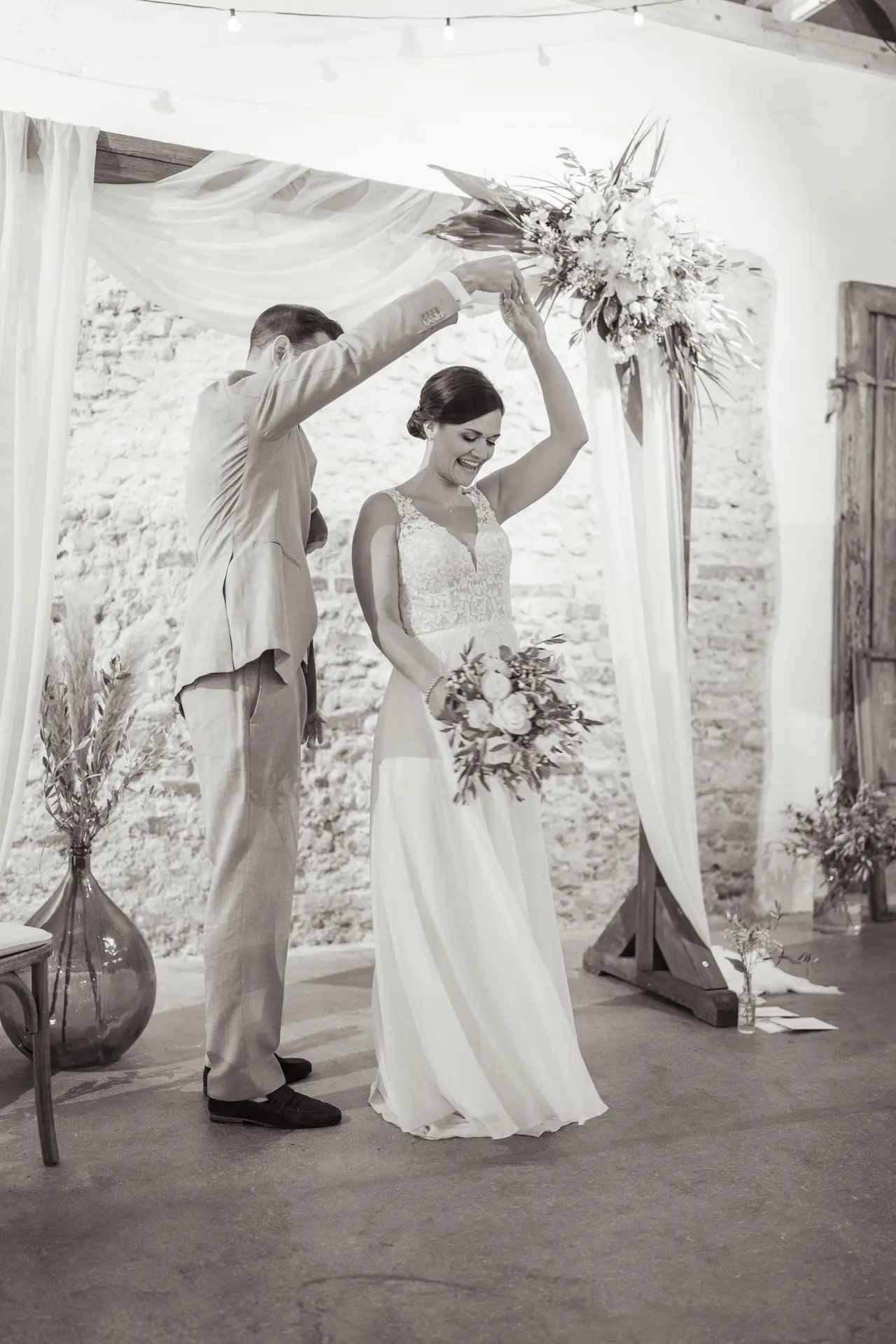 Keine Panik! Als erfahrener Hochzeitsfotograf habe ich immer einen Plan B. Oft reicht schon eine kurze Regenpause von 15 Minuten für schöne Paarfotos im Freien (das Licht ist bei bewölktem Himmel sogar schmeichelhafter als bei praller Mittagssonne!). Ansonsten nutzen wir überdachte Bereiche, schöne Schirme oder die stimmungsvolle Atmosphäre im Inneren der Location. Bei Steffi und Michi gab es auch eine sehr kurze Regenpause und überdachte Bereiche waren auch genug vorhanden.