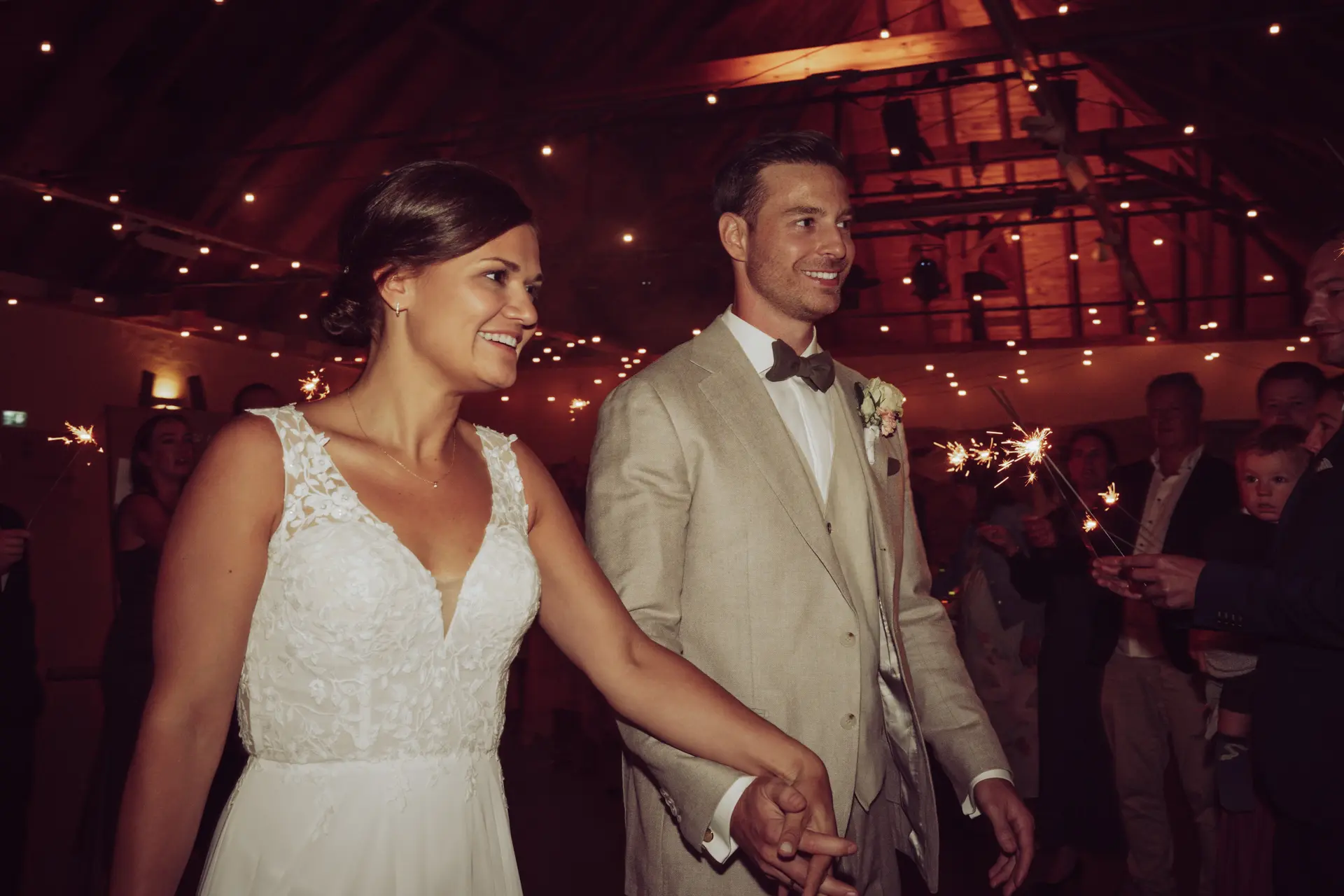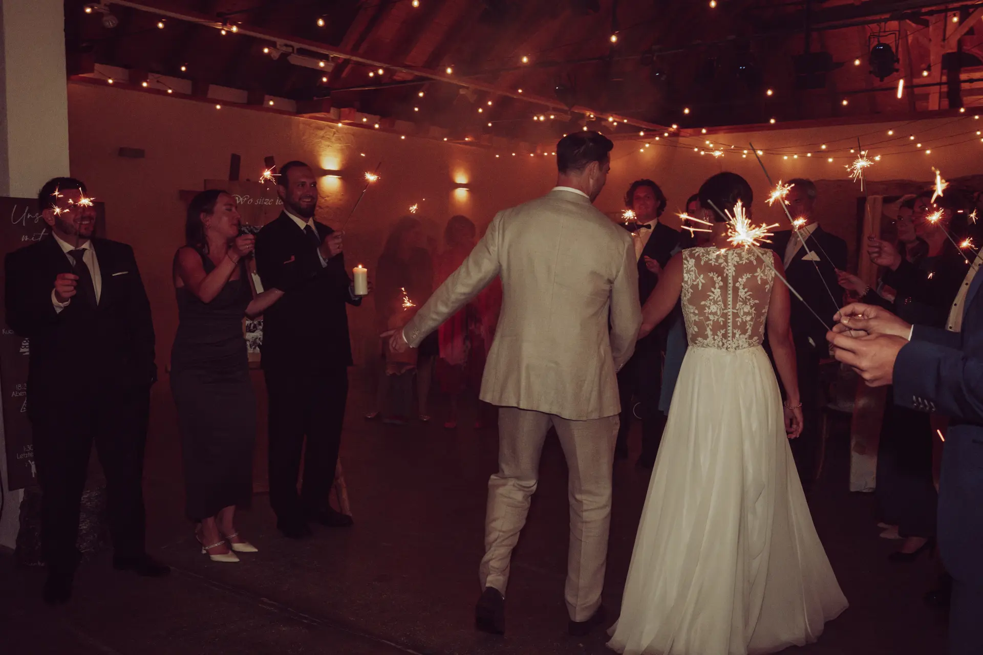 Am Abend wurde es noch einmal magisch. Durch ein Meer aus sprühenden Wunderkerzen zogen die beiden auf die Tanzfläche ein. Nach einer fulminanten Performance beim Eröffnungstanz gab es kein Halten mehr – der Startschuss für eine lange, ausgelassene Partynacht.