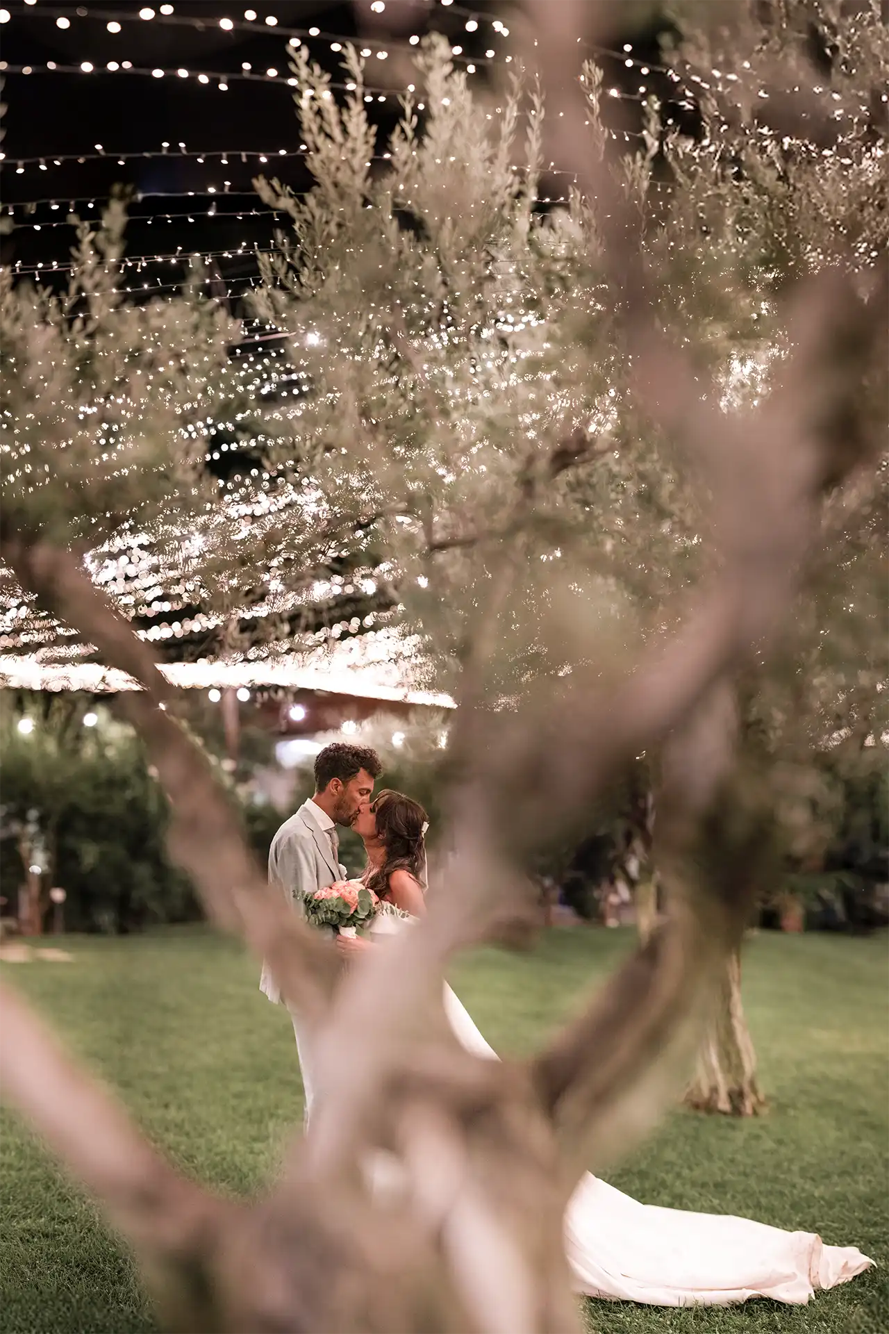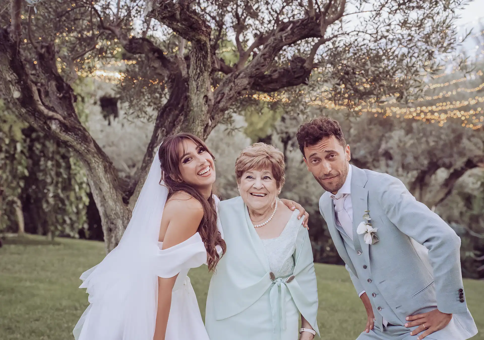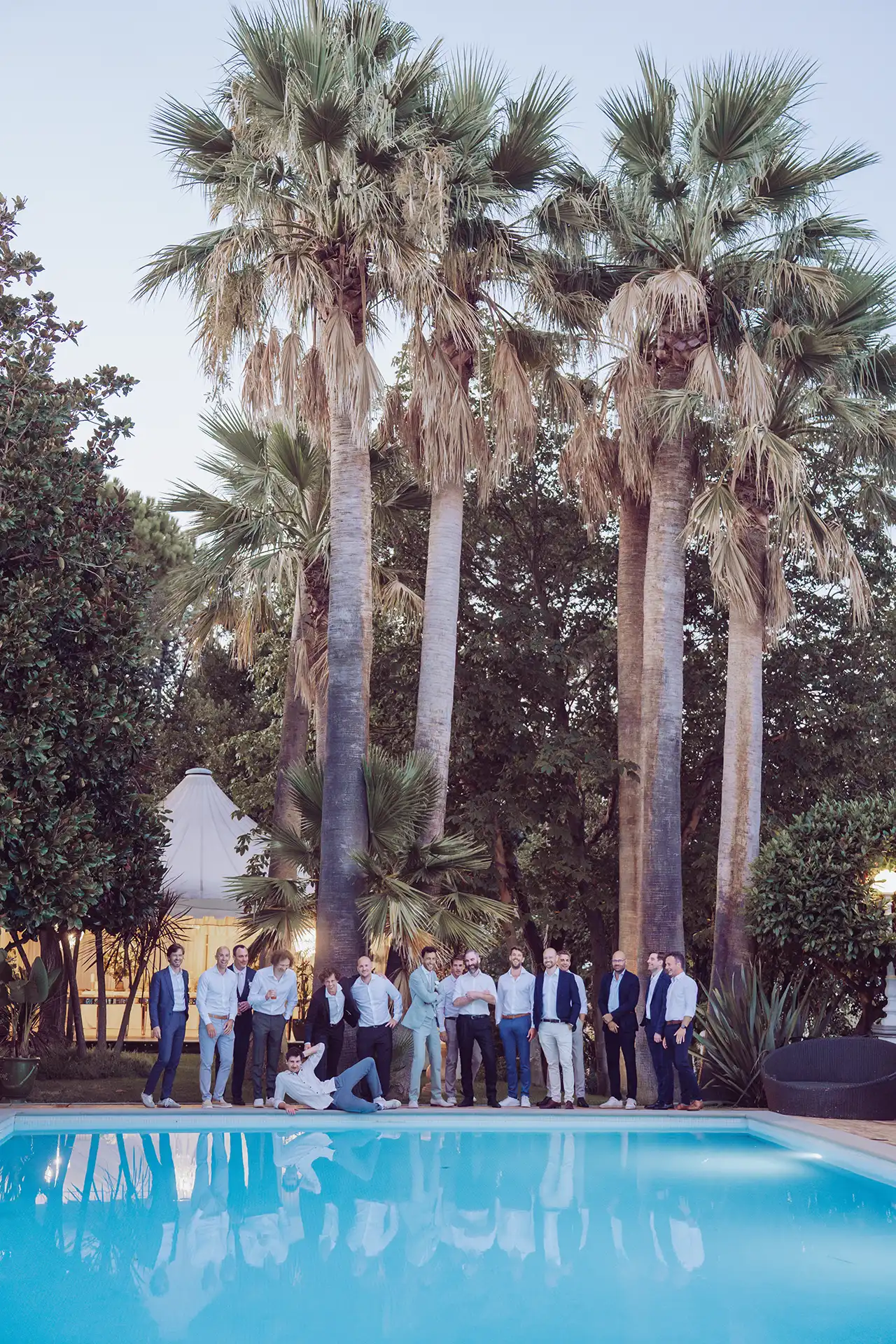 Auch wenn sich die Sonne wetterbedingt etwas versteckte, nutzten wir die blaue Stunde für stimmungsvolle Portraits im Olivengarten der Villa. Dieser verwandelte sich später in den Schauplatz für das große Finale: