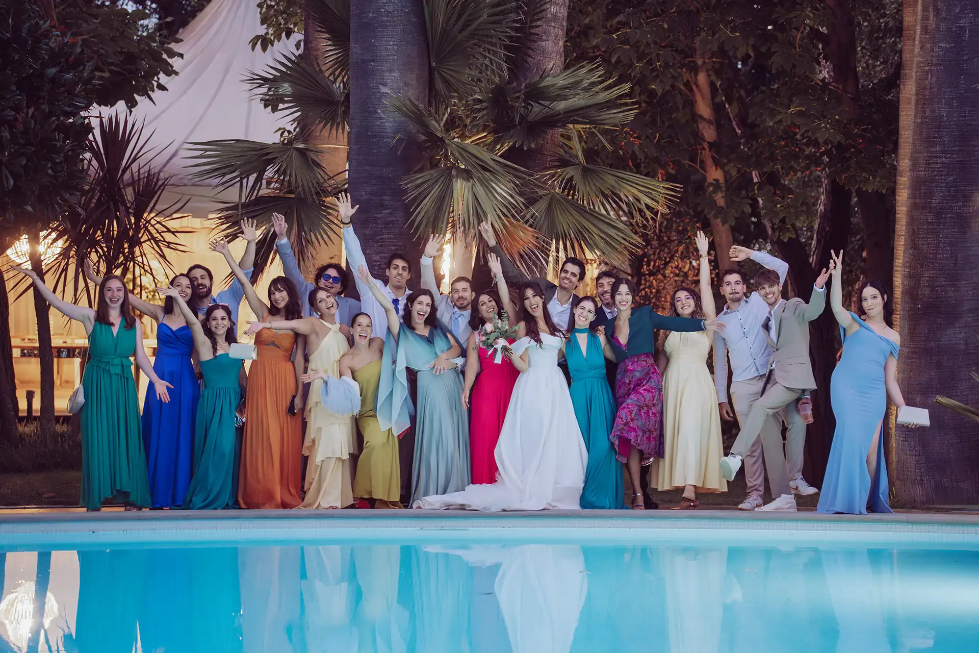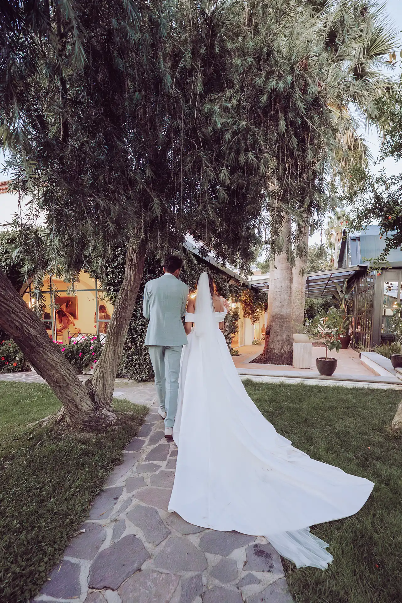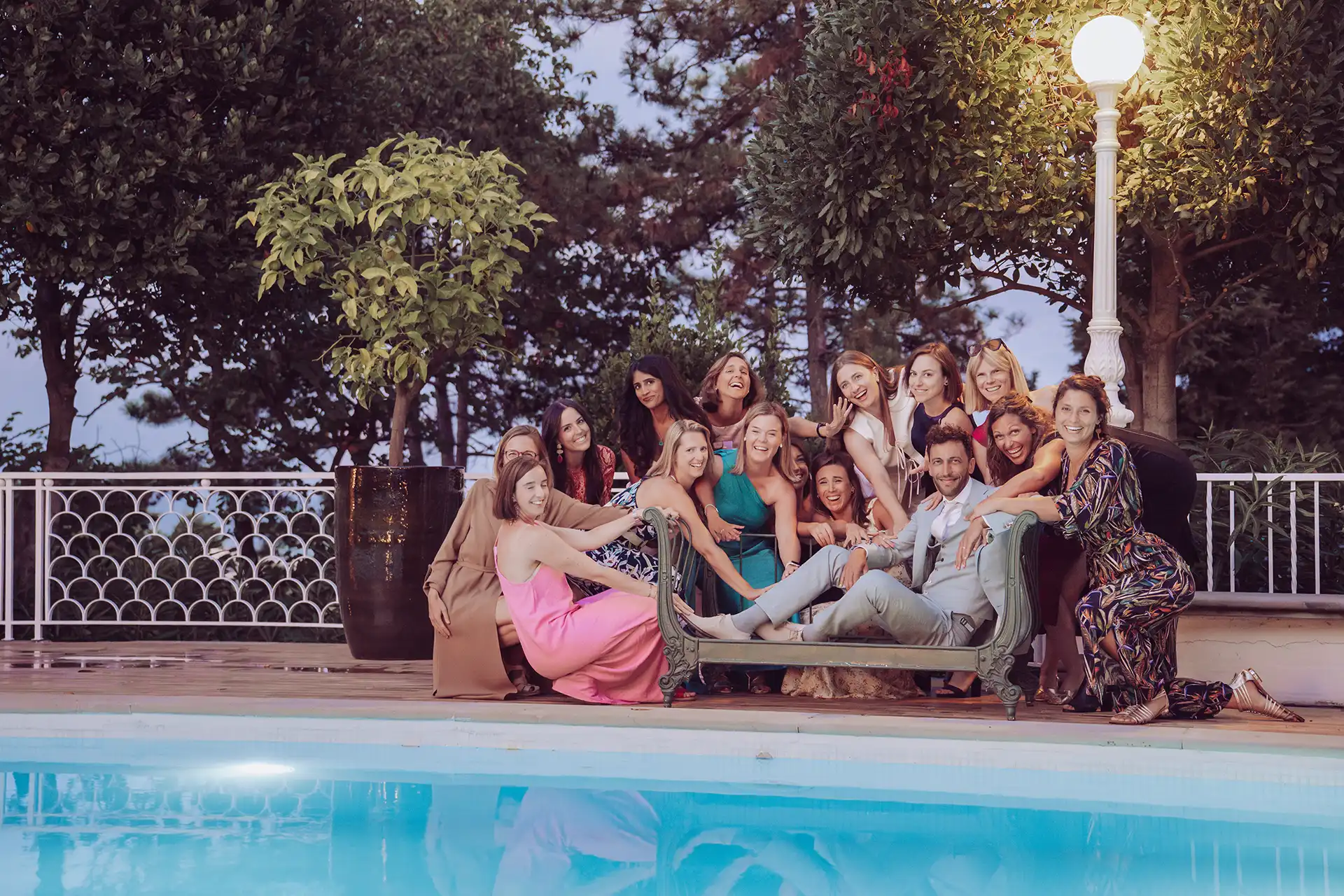 Auch wenn sich die Sonne wetterbedingt etwas versteckte, nutzten wir die blaue Stunde für stimmungsvolle Portraits im Olivengarten der Villa. Dieser verwandelte sich später in den Schauplatz für das große Finale: