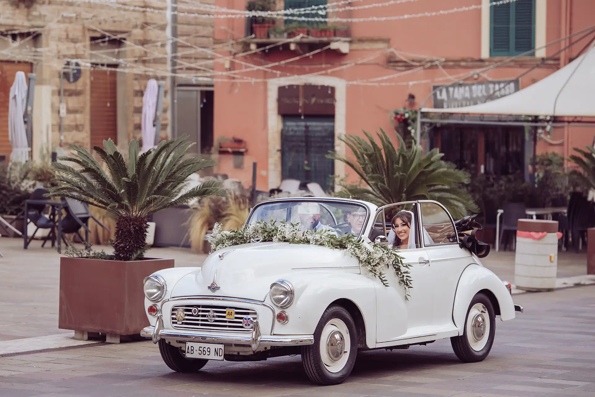 Nach der Kirche ging es zum Monumento al re Vittorio Emanuele II, wo uns ein Regenbogen über dem Meer für das Gruppenfoto begrüßte – wenn das kein Glücksbringer ist! Danach schnappte ich mir das Brautpaar und den Oldtimer für den Weg zum Hafen.